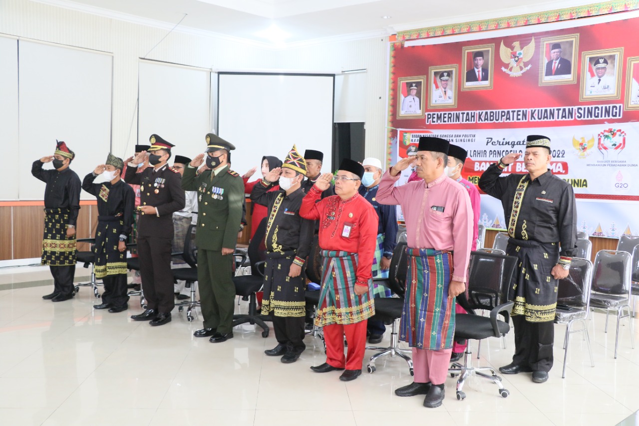 Kupaskasus.com, Kuansing - Pemerintah Kabupaten Kuantan Singingi beserta Forkopimda mengikuti upacara memperingati Hari Lahir Pancasila Tahun 2022 yang di gelar secara Luring dan daring dari ruangan multi media Kantor Bupati Rabu (1/6/2022).
