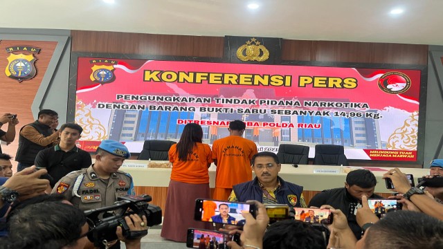 KupasKasus.com, Pekanbaru – Kepolisian Daerah (Polda) Riau kembali mencetak prestasi besar dalam perang melawan peredaran gelap narkotika. Kali ini, sebanyak 14,96 kilogram sabu berhasil diamankan dari jaringan narkoba internasional yang beroperasi di wilayah Riau. Dalam pengungkapan tersebut, dua tersangka yang berperan sebagai kurir ditangkap, sementara seorang bandar besar berinisial AL kini masuk dalam daftar pencarian orang (DPO).