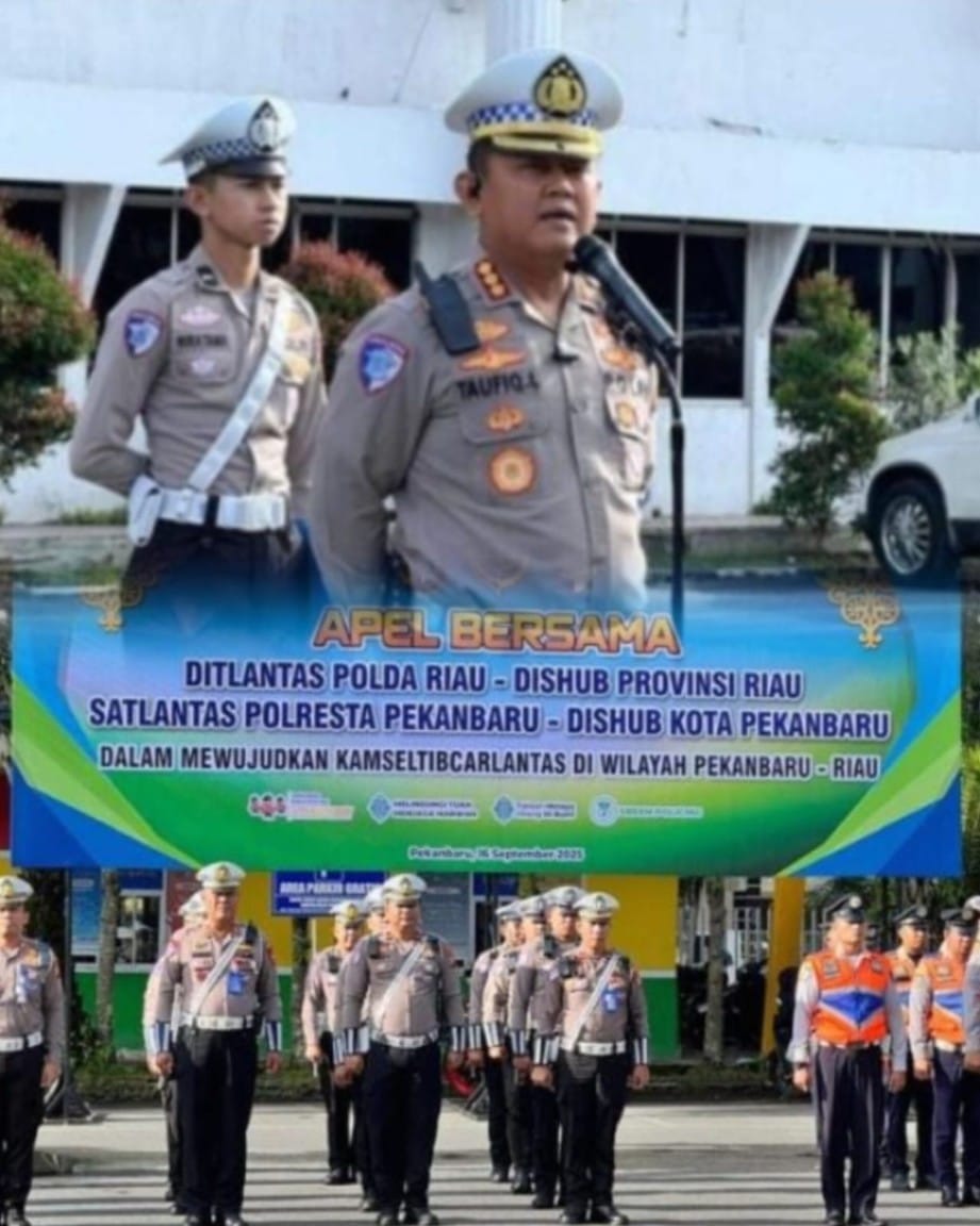 KupasKasus.com, Pekanbaru – Direktorat Lalu Lintas (Ditlantas) Polda Riau bersama Dinas Perhubungan (Dishub) Provinsi Riau dan Dishub Kota Pekanbaru menggelar Apel Gabungan yang dilanjutkan dengan Tactical Floor Game (TFG) Antisipasi Kerawanan Lalu Lintas. Kegiatan berlangsung di halaman Samsat Jalan Gadjah Mada Pekanbaru, pada hari Selasa (16/9/2025).