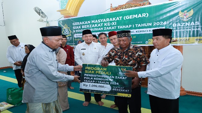 KupasKasus.com, Kerinci Kanan - Wakil Bupati Siak Husni Merza menghadiri pendistribusian zakat tahap I tahun 2024 di Masjid Al Muhajirin Kampung Buatan Baru, Kecamatan Kerinci Kanan, pada Rabu (3/4/2024).