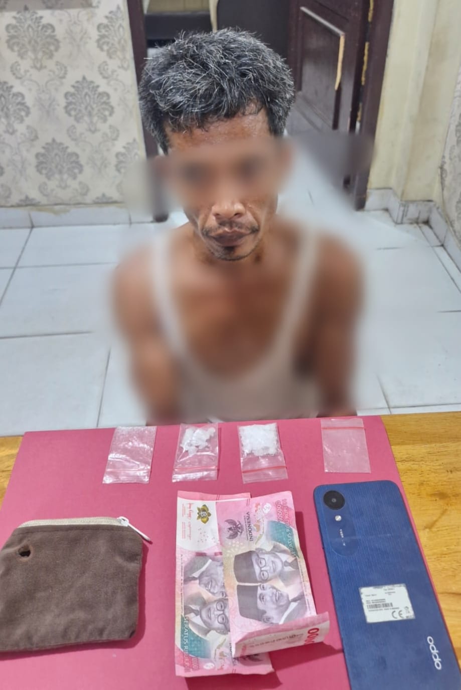 Tersangka yang berhasil diamankan adalah EL (39). Dari tangan pelaku, petugas berhasil menyita sejumlah barang bukti, antara lain 3 (tiga) paket narkotika jenis shabu dengan berat kotor 7,52 gram, 1 (satu) buah plastik klip bening, 1 (satu) unit handphone merek Oppo, 2 (dua) lembar uang pecahan Rp100.000,- 1 (satu) buah dompet warna cokelat, dan 1 (satu) unit sepeda motor Honda Beat dengan nomor polisi BM 2704 XX.