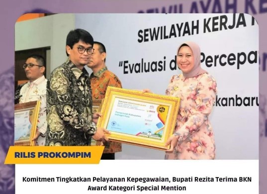 Hal yang sama juga disampaikan Rezita Meylani Yopi SE kepada bapak Plt. Kepala BKN Regional XII Pekanbaru, Haryomo Dwi Putranto atas penyerahan piagam penghargaan BKN Award 2023 kategori Special Mention-Komitmen Peningkatan Pelayanan Kepegawaian kepada Pemerintah Kabupaten Indragiri Hulu, "ungkapnya.