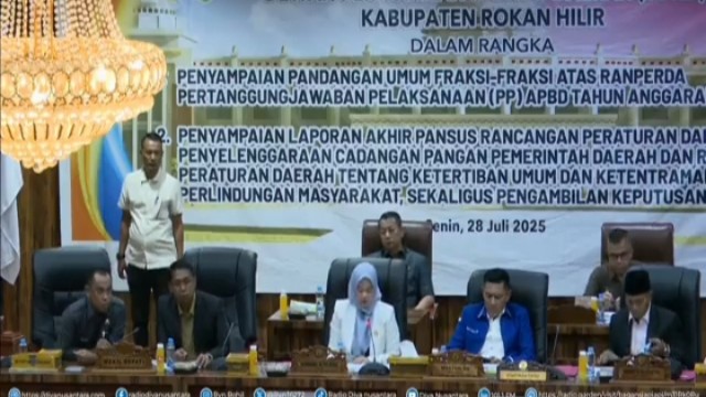 KupasKasus.com, Rohil - Dewan Perwakilan Rakyat Daerah (DPRD) Kabupaten Rokan Hilir (Rohil) mengelar rapat paripurna dengan agenda penyampaian pandangan umum fraksi-fraksi terhadap rancangan peraturan daerah (Ranperda) tentang pertanggungjawaban pelaksanaan anggaran pendapatan dan belanja daerah APBD tahun anggaran 2024, Senin (28/07/2025).