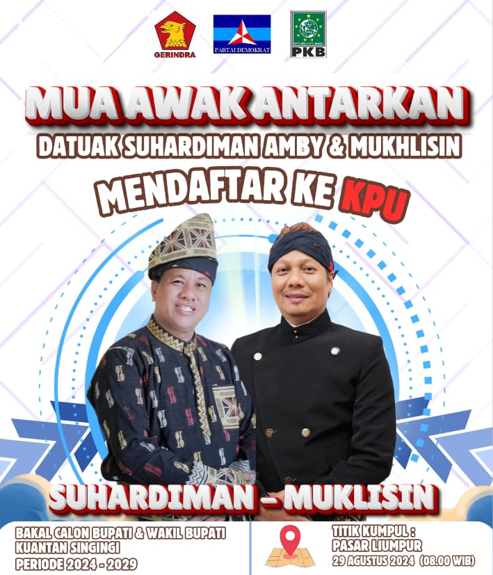 KupasKasus.com, Kuansing - Pasangan Suhardiman Amby-Muklisin Direncankan akan diarak oleh ribuan pendukung dan Masyarakat Kab Kuansing menuju ke kantor KPU Kuantan Singingi, Besok Pagi Kamis (29/8 2024) sekitar pukul 08.00 pagi, Guna Mendaftarkan sebagai Calon Bupati dan Wakil Bupati Pada Pilkada tahun 2024.