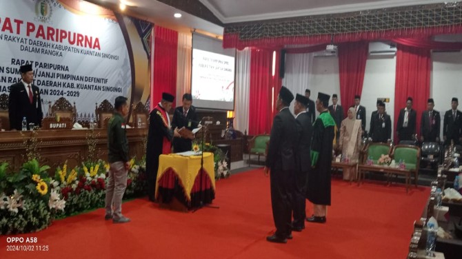 KupasKasus.com, Kuansing - Rapat Paripurna DPRD Kabupaten Kuantan Singingi dengan Agenda Pengucapan Sumpah/Janji Pimpinan Definitif DPRD Kabupaten Kuansing Masa Jabatan 2024-2029. Pada hari Rabu (2/10/2024) bertempat di Ruang Rapat Paripurna DPRD Kabupaten Kuantan Singingi.