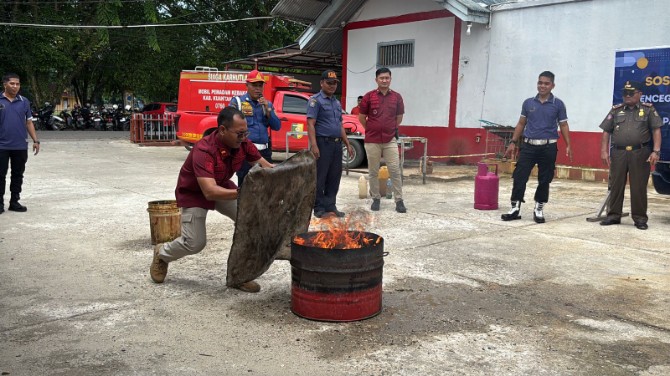 Setelah memberikan materi, ia melanjutkan dengan mencontohkan langsung dengan kobaran api kecil dengan menggunakn kain basah dan APAR. Kemudian dilanjutkan dengan para petugas Lapas Teluk Kuantan.
