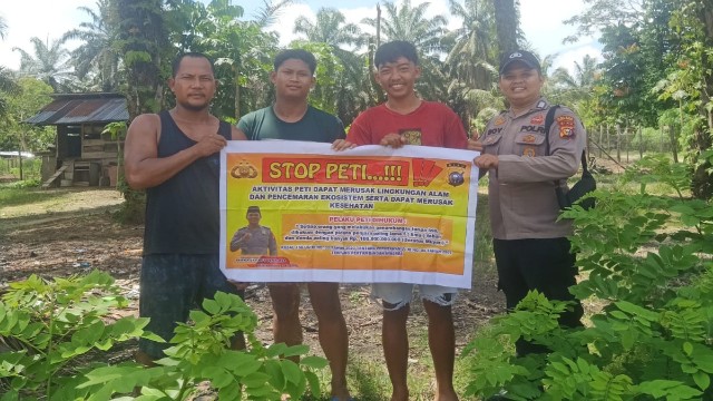 KupasKasus.com, Kuansing - Dalam rangka menjaga kelestarian lingkungan serta menegakkan hukum, Bhabinkamtibmas Polsek Singingi Bripka Eky Boy Venalosa melaksanakan kegiatan penyebaran dan penyuluhan Maklumat Kapolres Kuantan Singingi tentang larangan aktivitas Pertambangan Emas Tanpa Izin (PETI) di wilayah hukum Polsek Singingi, pada Rabu (21/5/2025).