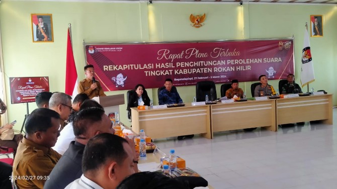 "Saya atas nama pemerintah daerah menyampaikan apresiasi dan terimakasih yang sebesar-besarnya atas kinerja KPU dan jajarannya yang telah sukses melaksanakan rangkaian kegiatan selama Pemilu, begitu juga kita ucapan terimakasih kepada Bawaslu yang telah bekerja siang malam dalam mengawasi pelaksanaan pemilu dari mulai kampanye sampai hari pelaksanaan," kata Afrizal Sintong saat memberikan kata sambutannya pada acara rapat pleno terbuka rekapitulasi hasil penghitungan perolehan suara tingkat Kabupaten Rokan Hilir, Selasa (27/02/2024) di aula rapat Kantor KPU Jalan Kecamatan Bagansiapiapi Rohil Propinsi Riau.