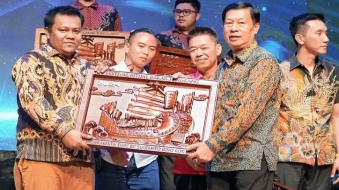 Di sela-sela acara malam Kesenian festival bakar tongkang 2024 tersebut ditandai dengan penyerahan oleh cendana mata oleh panitia acara kepada pimpinan forkominda dilingkungan Pemkab Rohil.