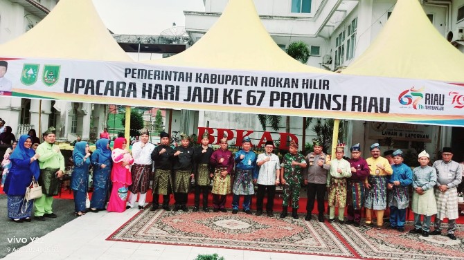 Prosesi peringatan HUT Ke 67 Provinsi Riau diawali dengan laporan komandan upacara kepada Inspektur upacara. Pembacaan Pancasila dan UUD 1946 serta pembaca Visi - Misi Riau oleh Ketua DPRD Maston. Pada kesempatan tersebut pimpinan daerah Rohil berhalangan hadir, maka bertindak sebagai Inspektur upacara di wakilkan kepada Kepala BKPSDM Rohil Acil Rustianto.