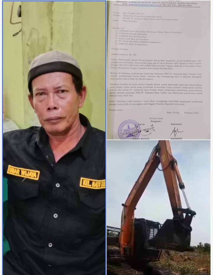 KupasKasus.com, Rohul - Hari ini, Rabu 19 Februari 2025, Perkumpulan Sumber Alam Makmur Jaya sebagai pemegang konsesi hutan sosial yang berada di wilayah Kecamatan Batu Teritip, Kota Dumai melaporkan adanya dugaan perambahan hutan kawasan hutan sosial dan HPH. PT. Diamond Raya Timber dilakukan oleh sekelompok masyarakat yang diduga di backup oleh oknum aparat.