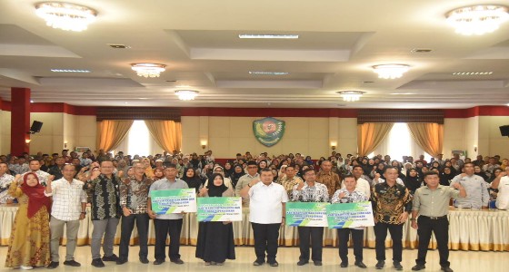Sebelum memberi sambutan, terlebih dulu Bupati menyerahkan kartu kepesertaan BPJS Ketenagakerjaan kepada guru dan tenaga kependidikan sebanyak 2.795 orang.