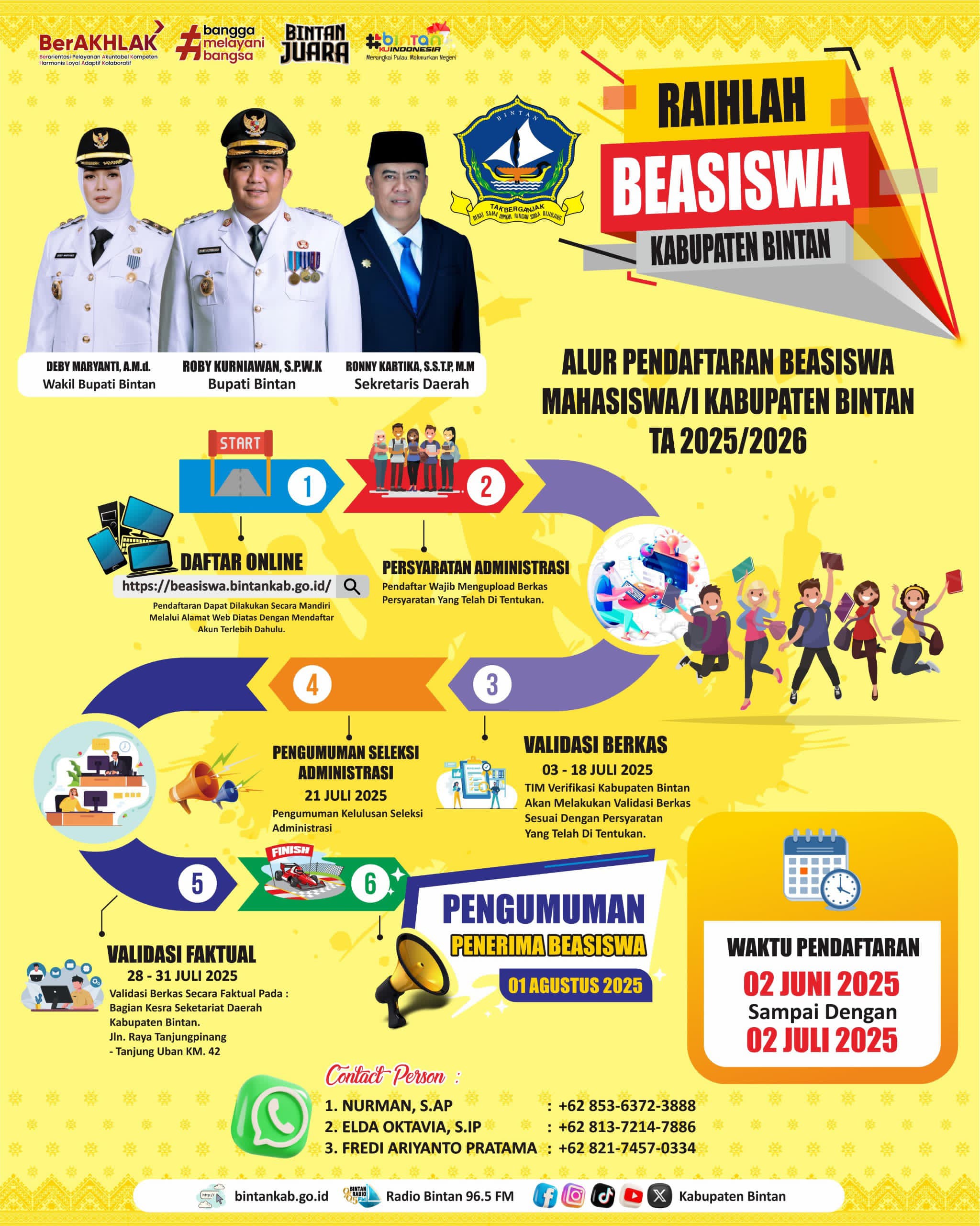 KupasKasus.com Bintan - Bupati Bintan Roby Kurniawan kembali membuka peluang beasiswa bagi putra-putri Daerah yang akan dan sedang menempuh pendidikan di Perguruan Tinggi Tahun Akademik 2025-2026. Kesempatan emas ini merupakan wujud dukungan Pemerintah Daerah bagi generasi muda Bintan menggapai masa depan yang lebih cerah melalui pendidikan yang berkualitas.
